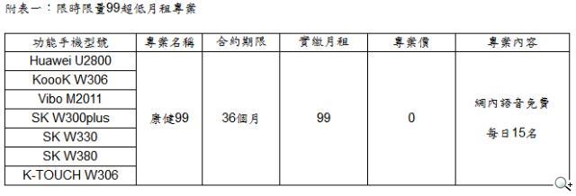 第一優惠:限時限量 99 超低月租專案,網內語音暢打免費,每日限 15 名申辦(詳見附表一)。