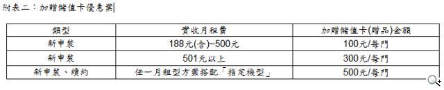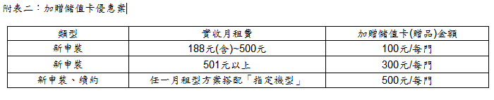 第二優惠:新申裝或續約實收月租 188 元(含)以上或任一月租型方案搭配指定機型,可享最高 500 元儲值卡優惠(詳見附表二)。