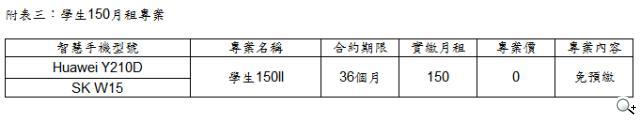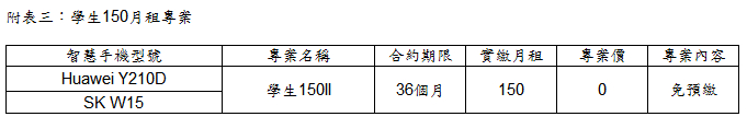 第五優惠:150 元學生專案,超夯雙卡智慧型手機 0 元帶回家(詳見附表三)。