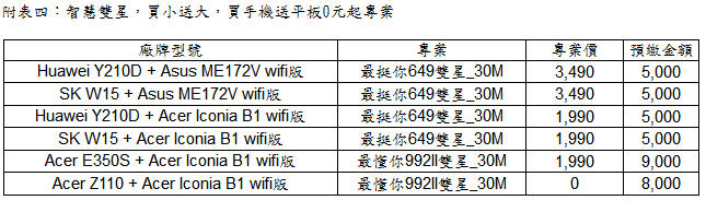 第六優惠:智慧雙星買小送大,買手機送平板只要 0 元起(詳見附表四)。