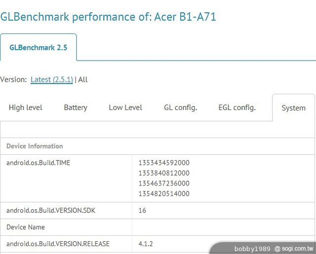 ▲Acer Iconia B1-A71 Tab 在今年 12 月初曾亮相知名效能測試網站 GLBenchmark,透露該機搭載 7 吋觸控螢幕,採用 Android 4.1 作業系統,內建 1.2GHz 雙核心處理器及 PowerVR SGX531 GPU。(圖片來源:GLBenchmark)